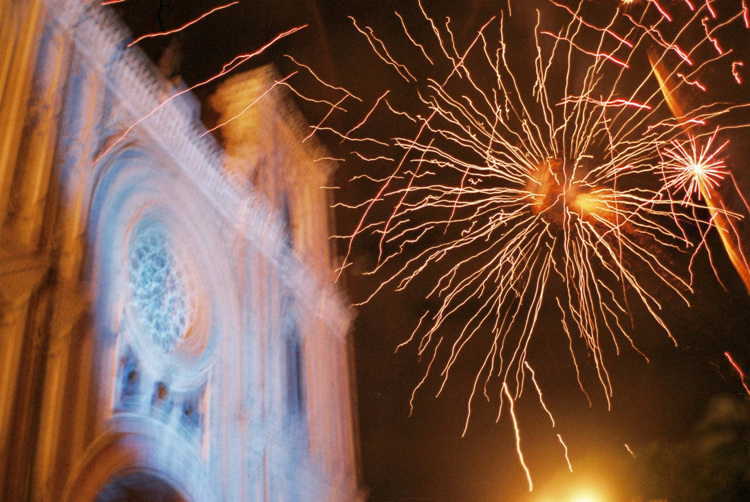 많은 달디 단 과자를 팔고, 밤엔 축포가 화려하다.